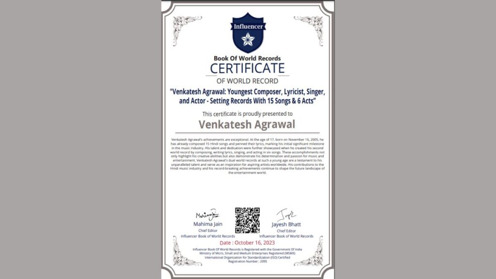 In a historic moment for the music industry, 17-year-old Venkatesh Agrawal has been officially acknowledged as the world’s Youngest Music Director and Songwriter. This remarkable achievement comes from the Golden Book of World Records, recognizing his exceptional musical contributions.