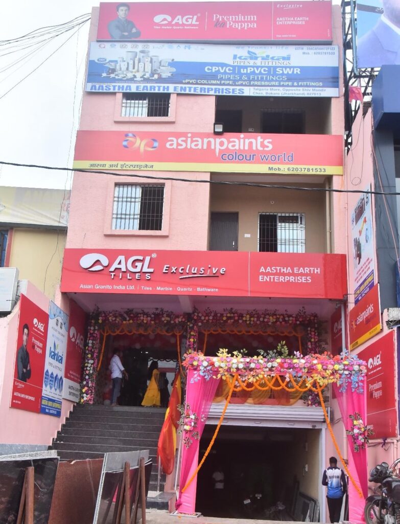 The showroom was inaugurated by Honorable Chief Guest, Sri Kumar Jaimangal Alias (Anup Singh), MLA -Bermo, Jharkhand, Mr. Manish Singh (DGM) Sales & Marketing – East 1, Asian Granito India Ltd in the presence of Mr. Manish Kumar (RSM-Sales & Marketing-Jharkhand), dignitaries of the city and esteemed guests on 22 July 2024. Located at Talgaria More, Opp Shiv Mandir, Chas, Bokaro – 827013 (Jharkhand) AGL Exclusive Showroom is opened in association with Aastha Earth Enterprises owned by Mr. Roshan Singh.