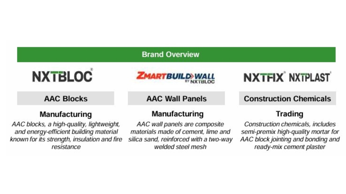 Incorporated in 2015, BIGBLOC Construction Ltd is one of the largest and only listed AAC block manufacturer in India, with a 1.3 million CBM annual capacity across plants in Gujarat (Kheda, Umargaon, Kapadvanj) and Maharashtra (Wada). The company, which markets its products under the ‘NXTBLOC’ brand, is one of the few in the AAC industry to generate carbon credits. With over 2,000 completed projects and 1,500+ in the pipeline, The company’s clients include Lodha, Adani Realty, IndiaBulls Real Estate, DB Realty, Prestige, Piramal, Oberoi Realty, Tata Projects, Shirke Group, Shapoorji Pallonji Group, Raheja, PSP Projects, L&T, Sunteck, Dosti Group, Purvankara Ltd, DY Patil, Taj Hotels, Godrej Properties, Torrent Pharma, GAIL among others.