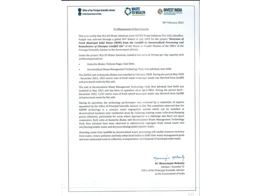On instigation of Modi 2.0 in july 2019 PMO had tasked Principal Scientific Advisor to identify, develop and deploy technologies to treat and divert fresh from landfills and use waste as source of energy.PSA put up a global Request for proposal to identify appropriate waste management technology. Among all the best world technologies E3 waste solutions an Indian startup was selected to demonstrate decentralized waste processing technology. To test and validate the technology, Two patented XAPER (zaper) machines by E3 waste were installed at two existing waste collection points at kasturba dhaloo and jafrabad dhaloo.