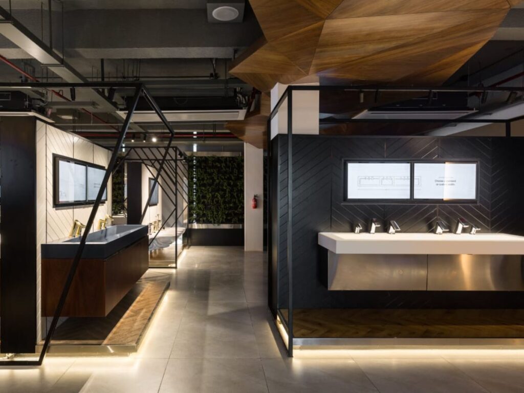 Sloan’s commitment to sustainability is evident in its LEED certified building, characterised by abundant natural light and indoor greenery. Vertical gardens and communal spaces create a thriving indoor environment, supported by a robust system. The four-story layout is carefully arranged, with storage, parking, and services on the ground floor, manufacturing facilities and a quality control lab on the first floor, and an experience center and corporate office on the second floor. A central staircase, adorned with design elements, traces Sloan’s journey through history as visitors ascend. Natural materials like wood, leather, brass, and veneer infuse a modern aesthetic throughout the office space. Additionally, each floor features themed conference rooms and washrooms inspired by Sloan’s product range, offering diverse experiences.