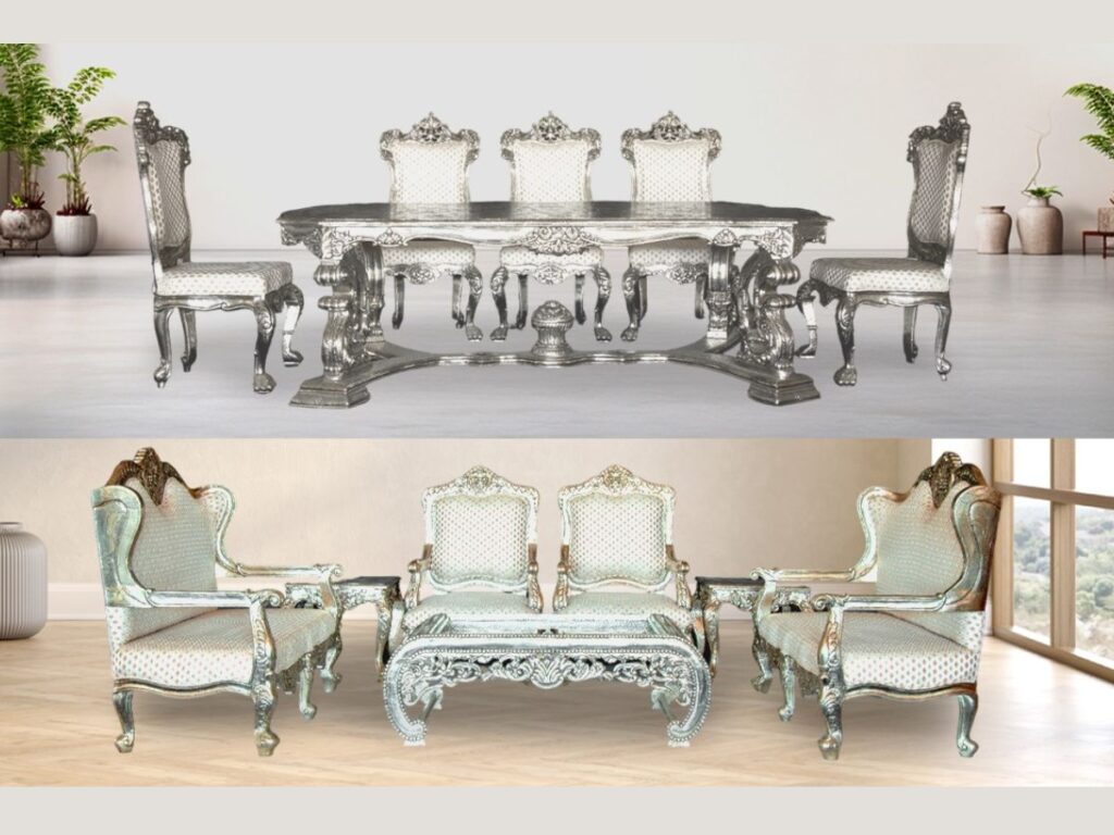 • Opulent Living Room Pieces: From ornate coffee tables to majestic silver sofas, each piece is a masterpiece that enhances the aesthetic appeal of any living space.